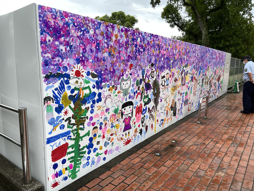 学生たちは、子どもたちにモチーフや表現方法を丁寧に説明しながら制作をサポートしました。参加者は、高さ2メートル・幅9メートルに及ぶ仮囲いをキャンバスに見立て、夢や動物、キャラクターなど自由な発想で描き出し、最後に倉敷市の花「藤」を加えて大作を完成させました。