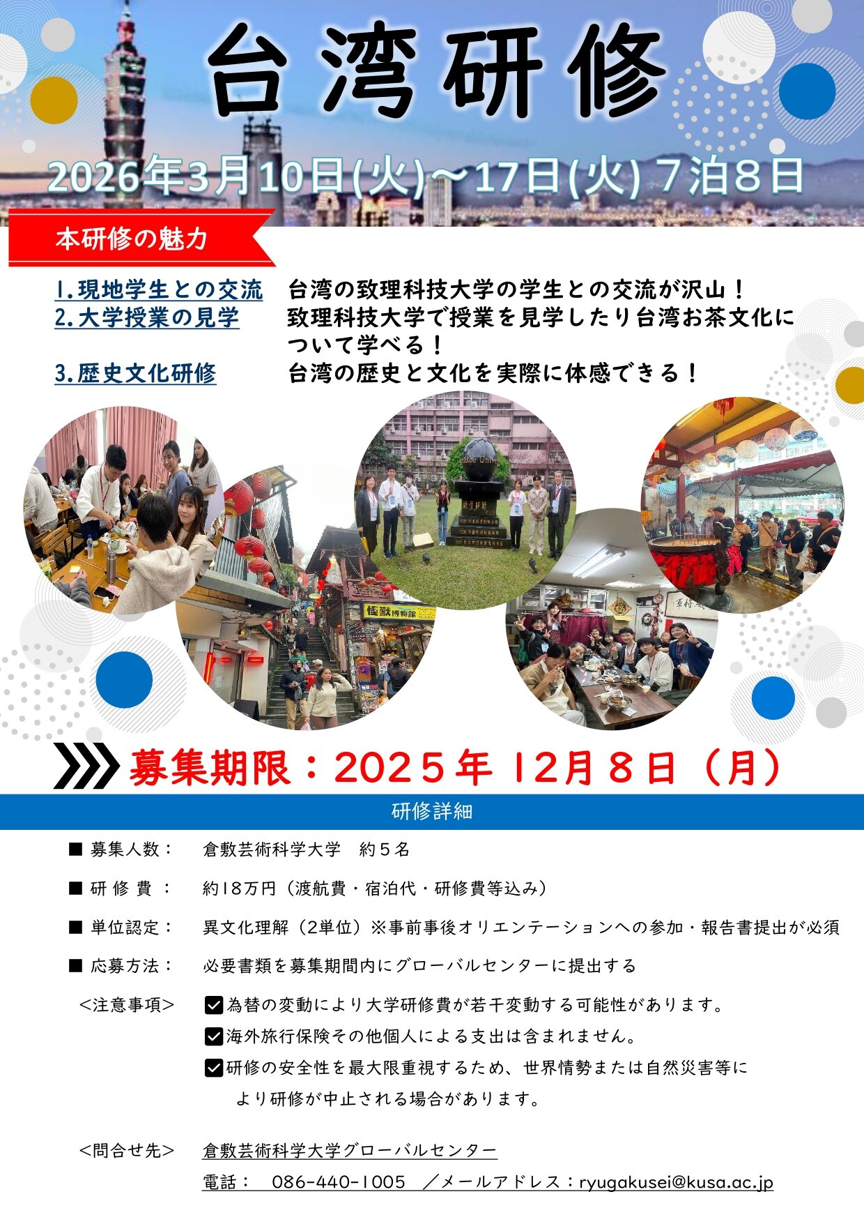 協定校である台湾・致理科技大学で学生交流を中心に1週間、台湾を満喫できる内容になっています。興味がある人、参加したい人はグローバルセンターまで!