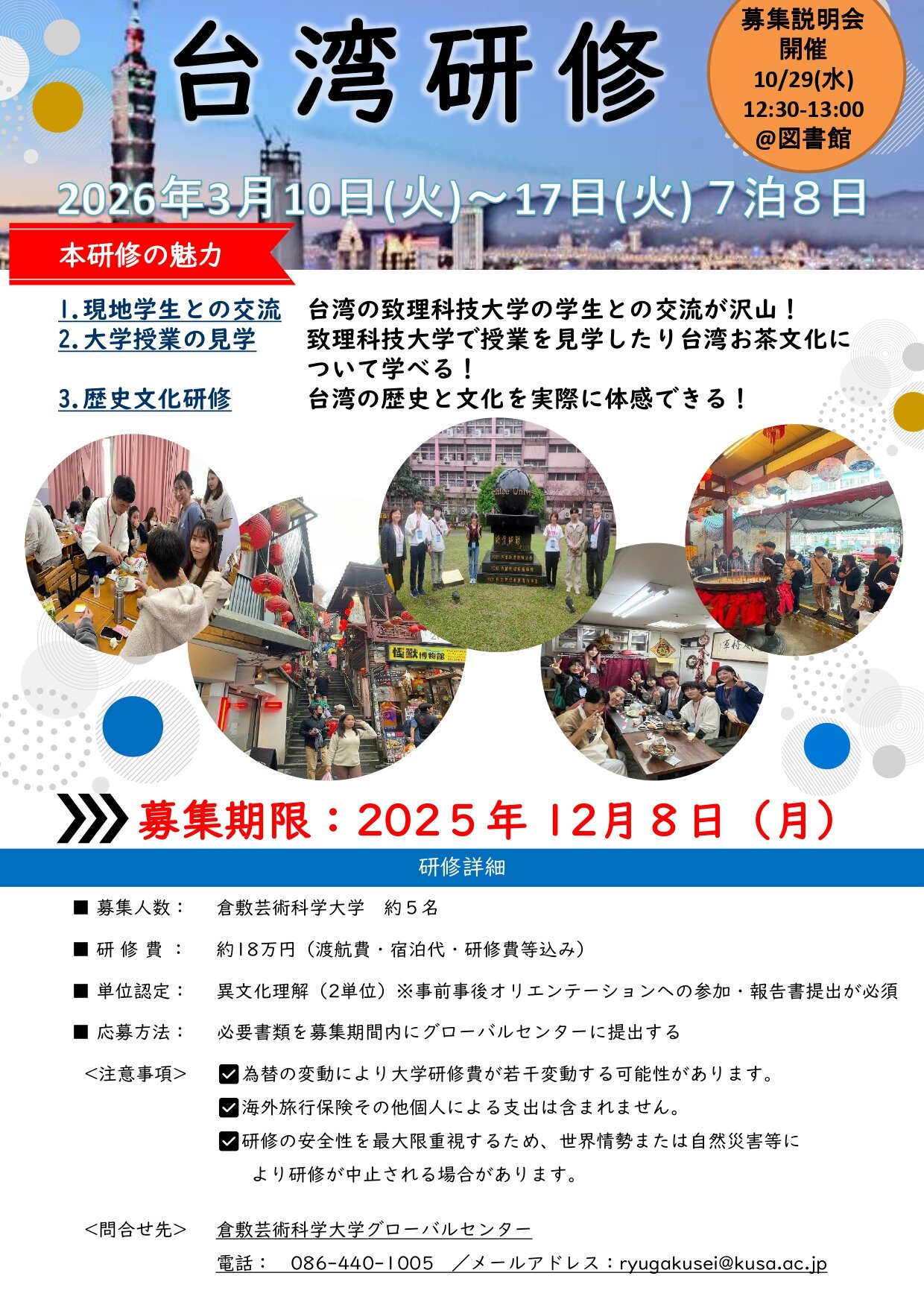 過去に参加した学生からも、「参加して国際交流の楽しさを知れた!」、「初海外が台湾でよかった!」と大好評の研修です。